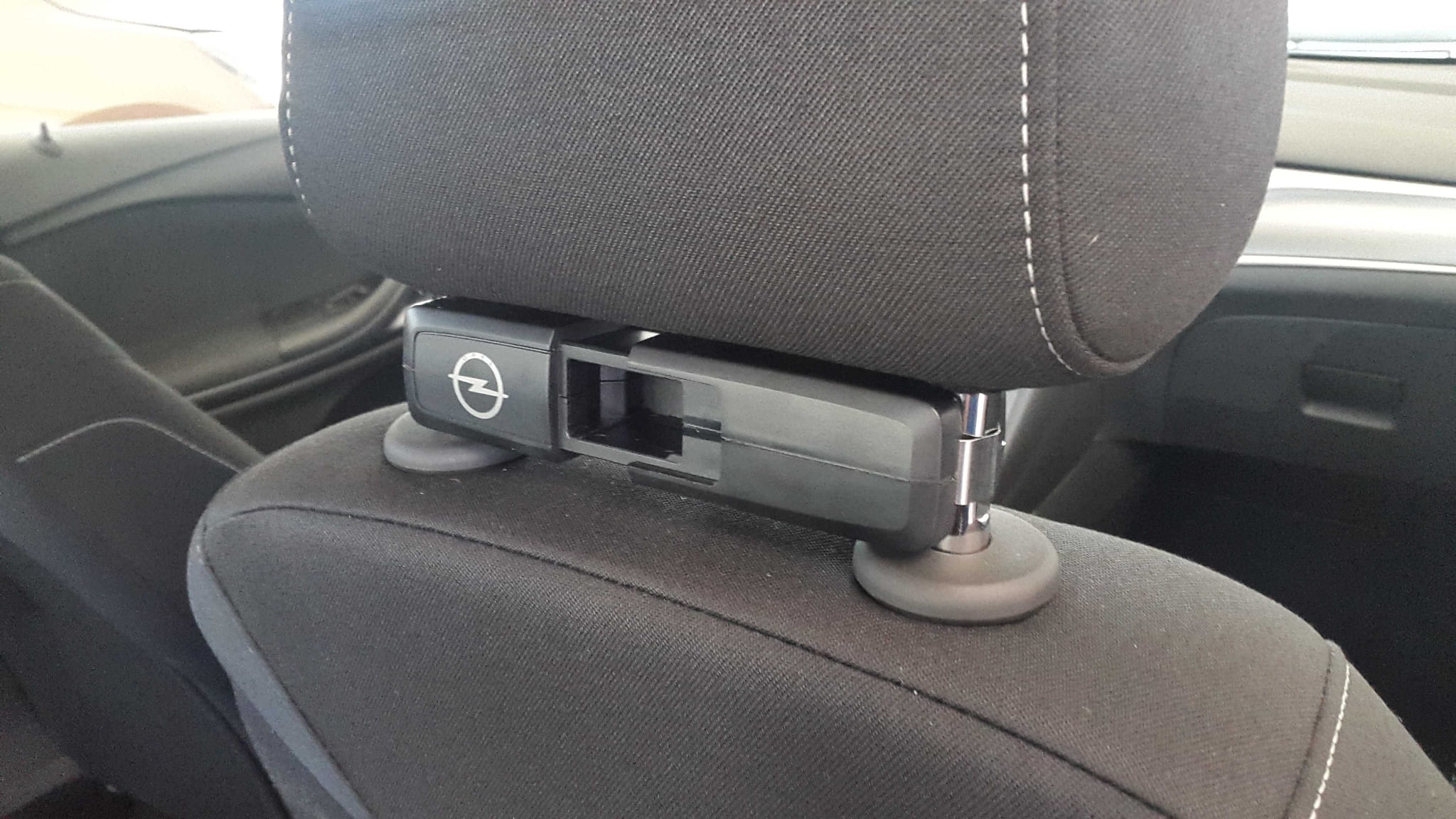 Przymocowany do zagłówka fotela kierowcy lub pasażera stanowi bezpieczną bazę dla wszystkich przystawek.