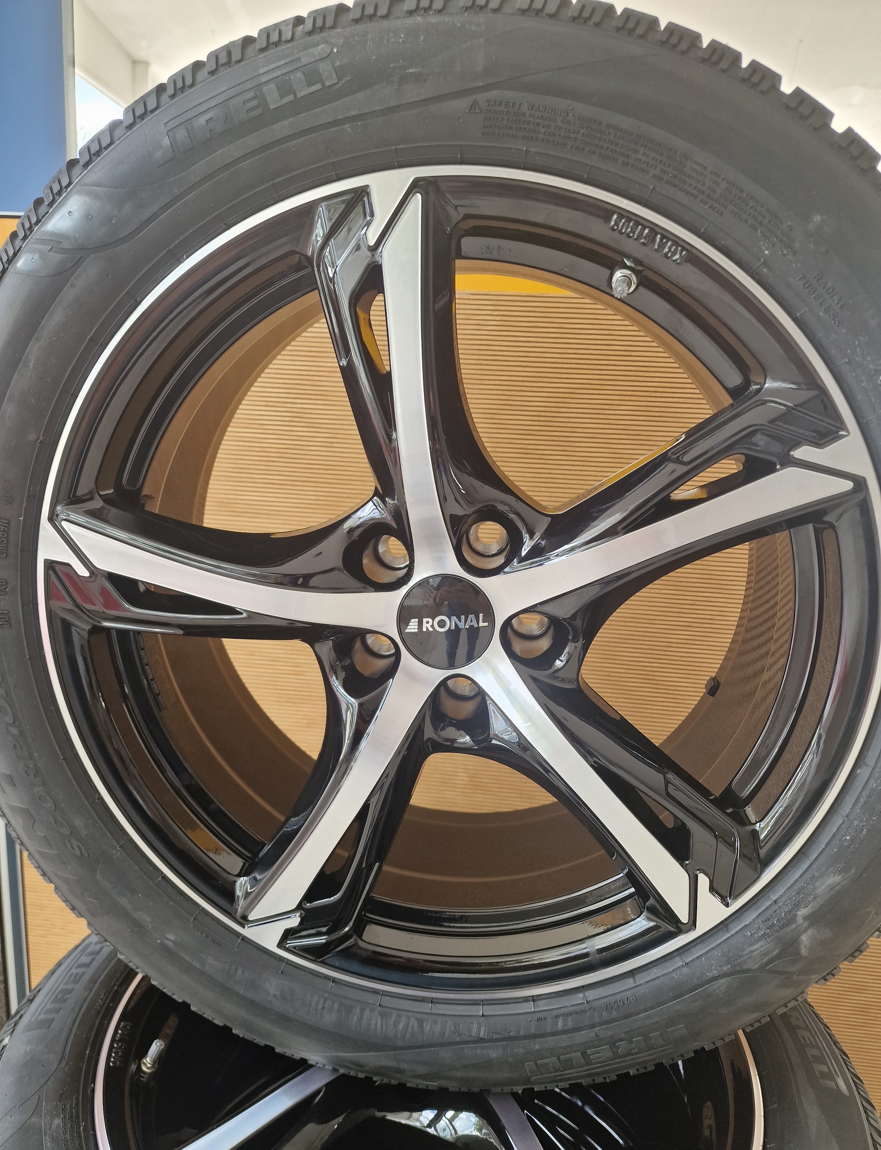 Nowe koła zimowe 19 cali Nokian dedykowane do modelu Baic 5 na felgach aluminiowych Ronal z czujnikami ciśnienia powietrza w kołach. Zestaw zawiera